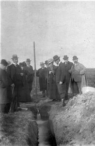 Byrådet besøger boringen ved Jegstrup. Hjalmar Kjems med koppen i hånden, smager på vandet.