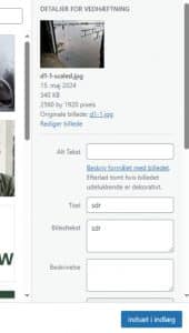 Udfyld feltet hvor der står “billedtekst”, denne beskrivelse bliver en del af artiklen. Når teksten er som ønsket, så tryk på “indsæt i indlæg”.