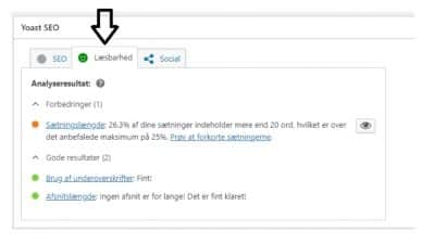 Programmet kan selv tjekke om der er problemer med f.eks. længden af dine afsnit. Scroll ned på siden til du finder afsnittet, der ligner billedet nedenfor og tryk på “læsbarhed”.