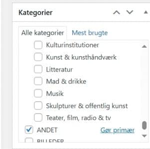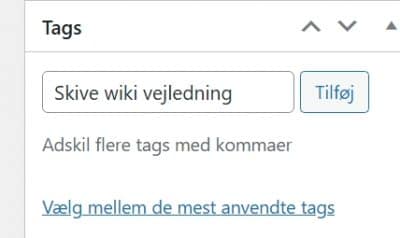 Hvis der er kategorier som du synes mangler fra listen, kan du med fordel indsætte “tags”. Skriv det ønskede ord i feltet og tryk “tilføj”, eller vælg Blandt allerede benyttede “tags”.