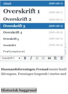 Overskrifterne inde i teksten skal laves i størrelse “overskrift 3”. Marker den ønskede overskrift, tryk på menuen “Afsnit” og vælg “overskrift 3”. Hvis der er behov for yderligere underniveauer af overskrifter, kan dropdownlisten bruges.